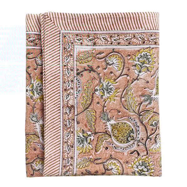 Pomegranate linneduk 170x270 cm från Chamois klär bordet i ett levande blommönster med naturlig lyster. Varje duk är handtryckt med traditionell indisk blockprintteknik, där träblock förs varsamt över linnet för att bygga upp motivet lager för lager. De små variationerna som uppstår gör varje exemplar unikt och ger dukningen en personlig, varm känsla.