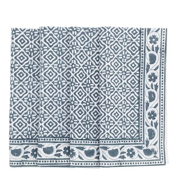 Chamois Simmi servett 50x50 cm 4-pack true blue är handtryckta servetter i bomull med ett livfullt mönster och tydlig känsla av genuint hantverk. Den traditionella indiska blockprinttekniken ger varje servett ett unikt utseende med naturliga variationer.