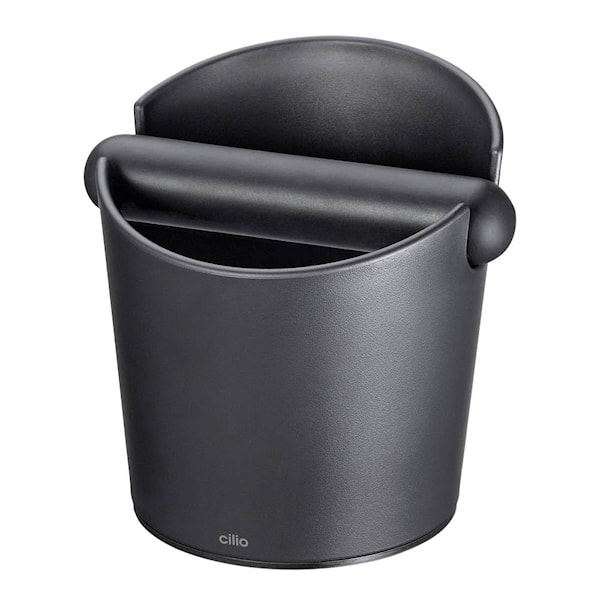 Cilio Barista knock box 12 cm är ett praktiskt tillbehör för att enkelt slå ur kaffegrut från espressomaskinens portafilter. Den silikonklädda stången dämpar ljudet och skyddar utrustningen, medan den halkfria basen håller behållaren stadigt på plats.