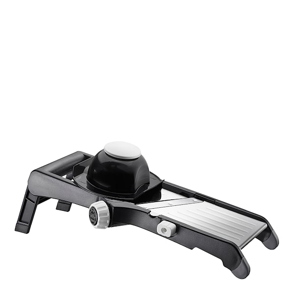 Mandolinjärn i rostfritt stål med inställbara skärtyper och ett medföljande fingerskydd från den tyska kökstillbehörstillverkaren Gefu.