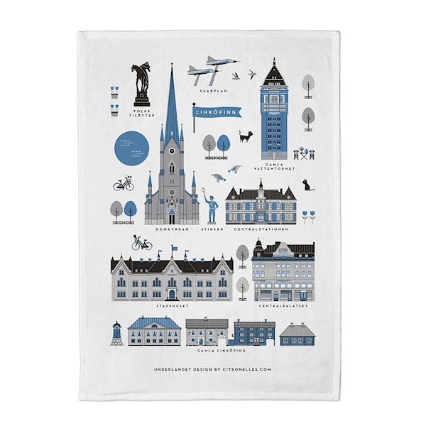 Citronelles blå kökshandduk hyllar Linköpings stadssilhuett med ett stilfullt mönster föreställande kända byggnader. Handduken är tillverkad i en blandning av 50% bomull och 50% linne som ger både hållbarhet och god absorptionsförmåga.