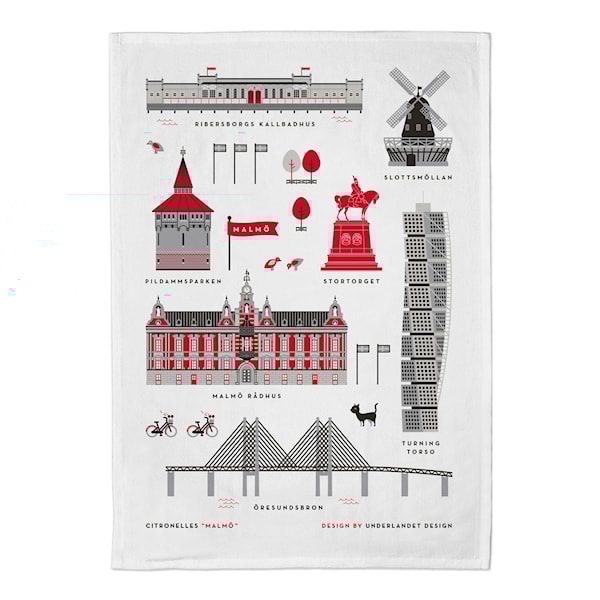 Denna röda kökshandduk från Citronelles lyfter fram Malmös karaktär genom ett mönster med stadens mest ikoniska byggnader. Tillverkad i en slitstark blandning av 50% bomull och 50% linne, vilket ger både god uppsugningsförmåga och lång livslängd.