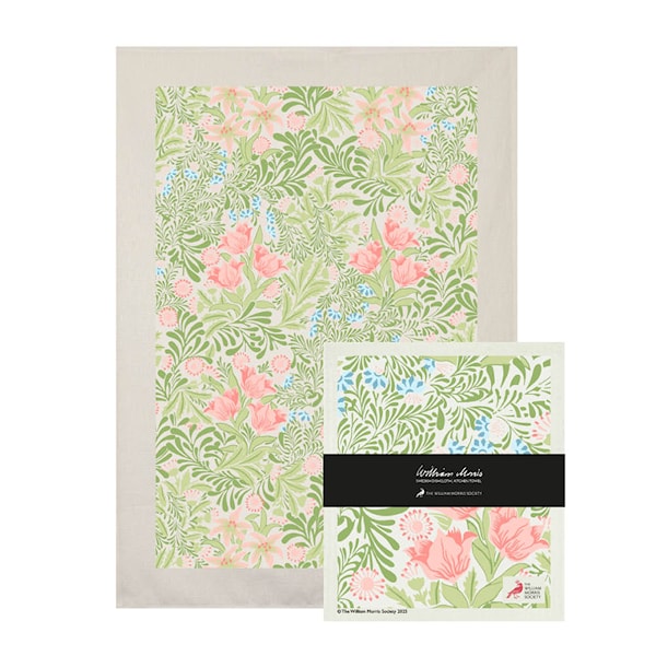 Handduken är gjord i en linne- och bomullsblandning som kombinerar slitstarkhet med hög absorberingsförmåga. Med sitt William Morris-motiv blir den ett härligt inslag på kroken eller över axeln under matlagningen.