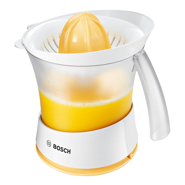 En elektrisk och kompakt citruspress från Bosch. Juicepressen har en stor, borttagbar, juicebehållare på 800 ml. Presskullen är universal och passar för både små och stora frukter. För att utvinna så mycket fruktjuice som möjligt roterar den reverserande och du kan enkelt kontrollera mängden fruktkött i juicen genom att reglera fruktköttsinställningen. Enkel att rengöra i diskmaskin och att förvara med det medföljande överdraget.