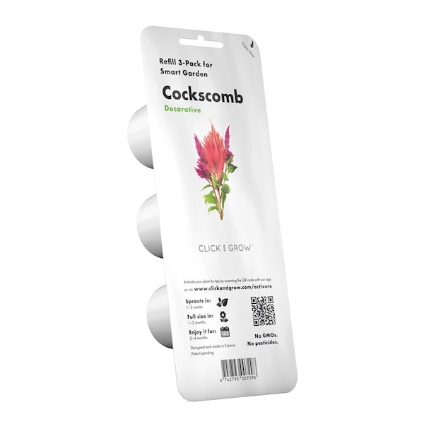 Fyll din inomhusträdgård med färg och form med detta refillpaket med 3 växtkapslar för Click & Grow Smart Garden (startpaket krävs och säljs separat). Varje kapsel innehåller Celosia argentea var. cristata , även kallad Tuppkam och Cockscomb, en växt känd för sina flamliknande blommor i klara färger.