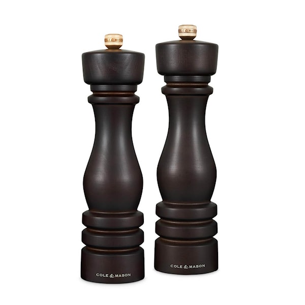 London Salt- och Pepparkvarnset i 22 cm, från Cole & Manson är en elegant tillägg till ditt kök. Enkel malningsjustering från fin till grov görs genom att vrida på knappen på kvarnens topp. Tillverkad av högkvalitativt bokträ och levereras utan kryddor.
