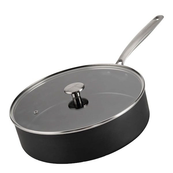 Den helsvetsade induktionsbasen ger effektiv värmefördelning oavsett spis. Handtaget är ihåligt för att förbli svalt under tillagning. Pannan tål både ugn och diskmaskin.