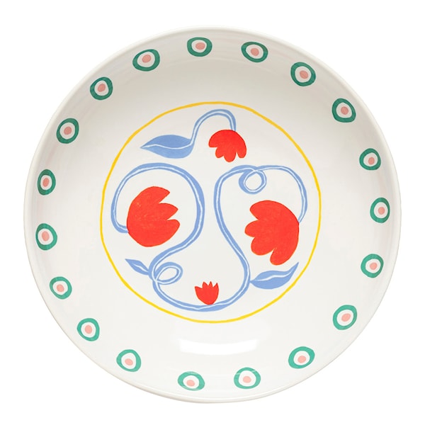 Bliss djup salladstallrik / pastatallrik 25 cm från Costa Nova är en vacker hyllning till Medelhavets sorglösa atmosfär. Med röda blommor som slingrar sig elegant runt ljusblå stjälkar tillför tallriken en fräsch och lekfull känsla till dukningen.
