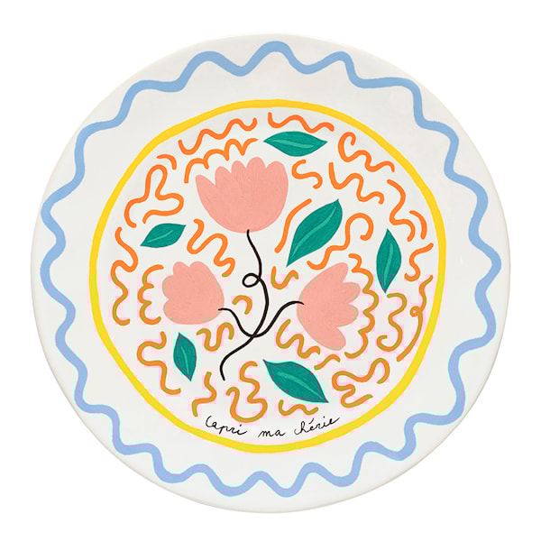 Den flata tallriken med en diameter på 27 cm är idealisk för allt från fräscha sallader och grillade grönsaker till fiskrätter och festliga serveringar. Designen gör den både funktionell och dekorativ, och den ljusa färgkombinationen ger dukningen ett fräscht och modernt uttryck.
