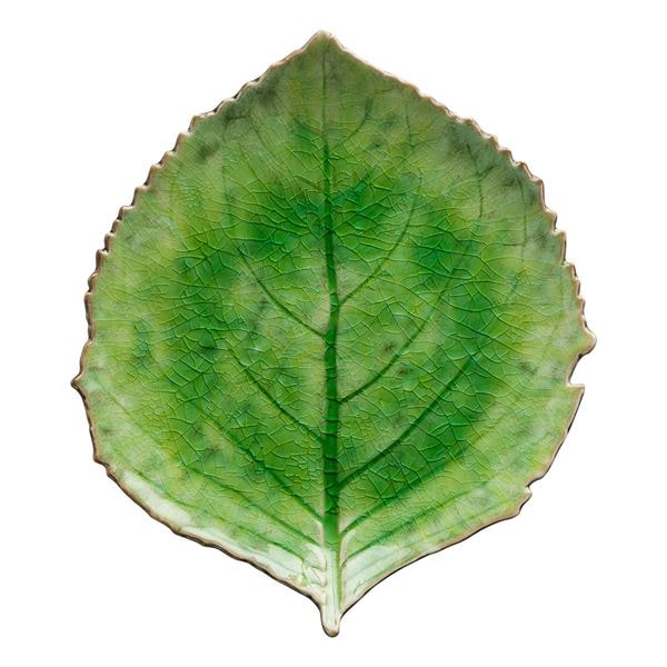 Den bladformade tallriken med måtten 22 x 19 cm är idealisk för servering av smårätter, desserter eller som ett dekorativt inslag i dukningen. Den djupa gröna färgen i kombination med svart skapar en sofistikerad kontrast som fångar blickarna och tillför en elegant ton.