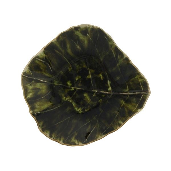 Den unika lövformen, med måtten 11 x 10 cm, gör skålen idealisk för servering av smårätter, dippsåser eller som ett dekorativt inslag i dukningen. Färgkombinationen av mörkgrönt och svart ger skålen ett sofistikerat och naturinspirerat uttryck.