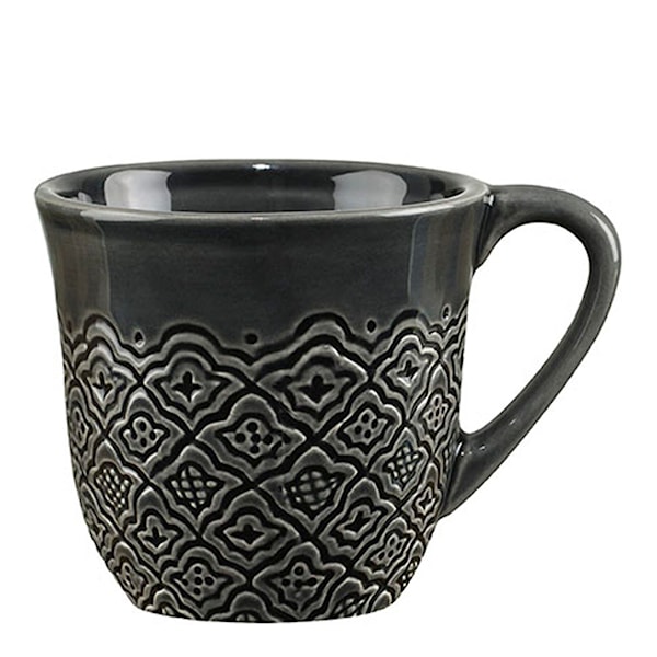 En robust mugg i stengods som ger intryck med sitt reliefmönster. Perfekt storlek för espresso och glögg. För att få fram den unika mönstereffekten i Orientservisen görs den för hand av duktiga hantverkare. Tekniken gör att glasyrerna kan skifta en aning i färgton mellan olika produkter. Denna serie tål diskmaskin och mikrovågsugn, och blir en iögonfallande dukning med sina vackra delar, från tallrik till serveringsfat.
