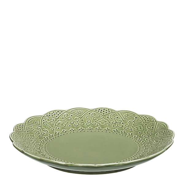 Liten tallrik eller assiett i glaserad stengods som passar bra till förrätt eller efterrätt. För att få fram den unika mönstereffekten i Orientservisen görs den för hand av duktiga hantverkare. Tekniken gör att glasyrerna kan skifta en aning i färgton mellan olika produkter. Denna serie tål diskmaskin och mikrovågsugn, och blir en iögonfallande dukning med sina vackra delar, från tallrik till serveringsfat.