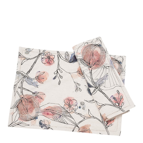 Hanami bordsunderlägg från Cultdesign är ett set med två vackra, dubbelsidiga bordstabletter som förenar funktionalitet med konstnärlig design. Tillverkade av en blandning av bomull och lin, pryds de av ett handmålat akvarellmönster som ger ett livfullt och sofistikerat uttryck.