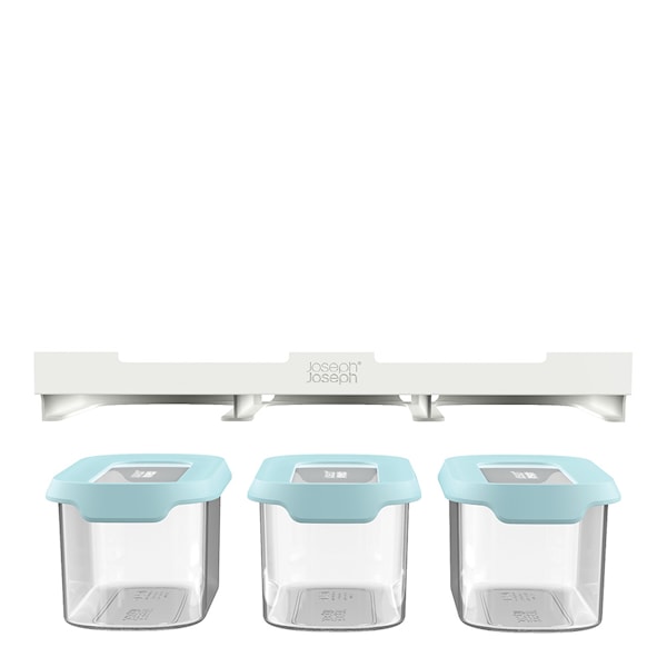 Detta innovativa förvaringsset från Joseph Joseph utnyttjar det annars outnyttjade utrymmet under hyllplan och hjälper dig att frigöra plats i skåpen. Setet innehåller tre behållare à 900 ml samt en förvaringsskena som enkelt monteras utan verktyg – bara fäst medföljande 3M-tejp och vänta 24 timmar innan behållarna hängs på plats.