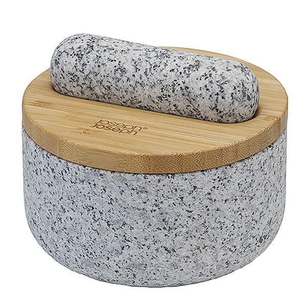 Denna eleganta mortel från Joseph Joseph kombinerar funktion och design i ett och samma köksredskap. Med sin solida konstruktion är den idealisk för att mala kryddor, örter och frön, samtidigt som det medföljande locket i bambu gör den lätt att förvara när den inte används. Locket fungerar även som en liten skål eller förvaring för ingredienser under matlagning.