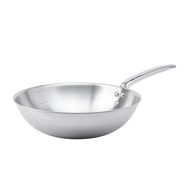 Wokpanna från De Buyer Alchimy i rostfritt stål gör det möjligt för en att steka ingredienserna i snabb takt utan spill. De Buyer Alchimy Wokpanna har som resterande produkter som tillhör serien en trelagradkonstruktion i rostfritt fritt stål, där innersta skiktet är tillverkat i rostfritt 18/10 stål, handtaget är nitat för att hålla sig svalt och saknar sandwichbas för att inte påverka prestandan.