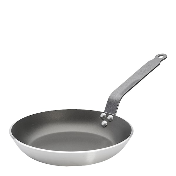 Det nitade handtaget med blått epoxibeläggning ger ett säkert grepp och en extra dimension av stil och funktionalitet. Den franska böjningen på handtaget gör det enkelt att hantera, och den eleganta designen kommer garanterat att imponera i ditt kök. Denna non-stick stekpanna är enastående både i matlagning och underhåll, med enkla instruktioner för handtvätt och användning av icke-slipande svamp för att hålla den i toppskick under många års användning.