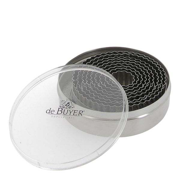 Kakformssats Rund 9 delar 3-11 cm från de Buyer är ett praktiskt set med 9 räfflade runda kakformar. Kakformarnas övre kant är bekvämt rundad för enkel hantering när du bakar samtidigt som den undra har en skarpare kant för precisa former. Formarna har en diameter på 3 cm som minst och 11 cm på den största. Passar utmärkt för alla typer av kakor, bakverk och desserter.