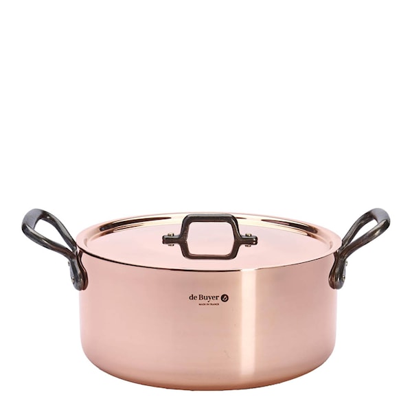 Koppargryta med lock, en insida av rostfritt stål och en botten anpassad för induktionshällar i serien Prima Matera från de Buyer.