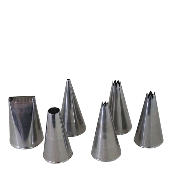 De Buyer Tyllset 6 delar består av sex tyllar tillverkade i rostfritt stål där varje tyll har sitt eget unika mönster. De största tyllarna kan du till exempel spritsa potatismos och grädde med och de mindre passar utmärkt till om du vill dekorera tårtor eller cupcakes.