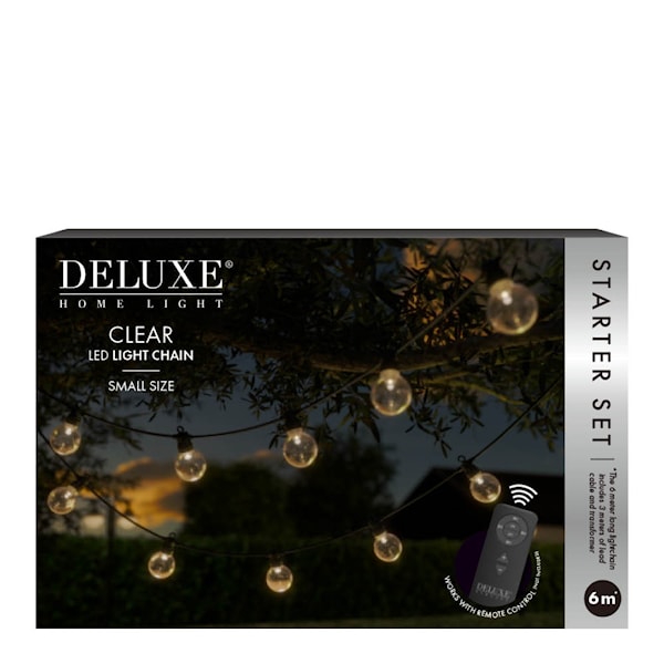 DeluxeHomeart LED Ljusslinga Clear Starter Set Small 6 m är ett komplett startpaket med 10 klara lampor och en total längd på 6 meter – inklusive 3 meter strömkabel med transformator. Den stilrena designen och det varma ljuset gör ljusslingan till ett dekorativt inslag i både inne- och utemiljöer.