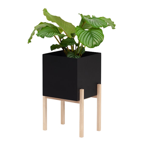 Då krukan kommer med en piedestal går det också att placera dem på golvet för att skapa olika nivåer i rummet. Krukan är gjord av pulverlackad metall, en snygg kontrast till piedestalen i massiv ask.