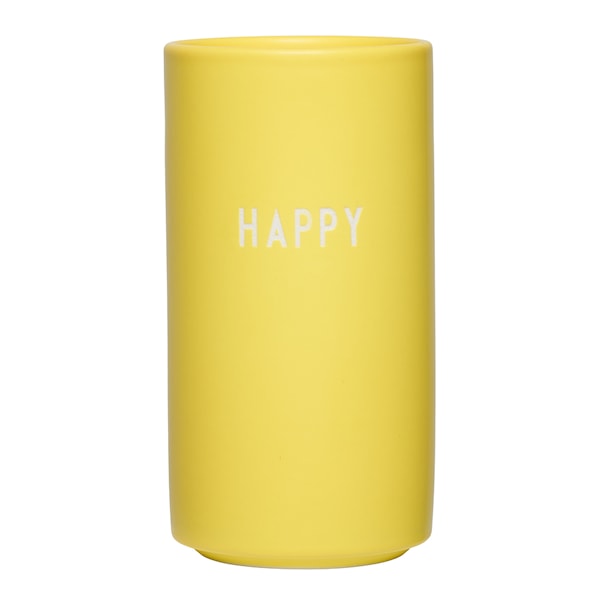 Favourite vase "HAPPY" från Design Letters är en liten och mångsidig vas med ett tydligt uttryck. Med sin kompakta höjd på 11 cm och gula färg passar den utmärkt för en ensam blomma eller en liten bukett. Vasen kan även användas som ljusstake genom att sätta in en separat ljusinsats. Utöver det passar den perfekt som pennhållare, tandborsthållare och redskapshållare - bara fantasin sätter gränser för alla dess användningsområden.