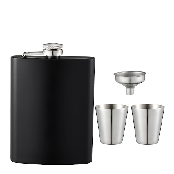Inkluderar en fickflaska med en kapacitet på 2,3 dl, 2 snapsglas och en tratt