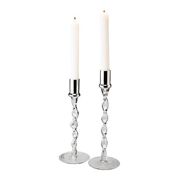 Ett elegant set med ljusstakar i glas med en silverfärgad topp. Detta stilrena par är en utmärkt gåva som blir en höjdpunkt i varje hem. Lika vackra i bokhyllan som tända med ljus på middagsbordet.
