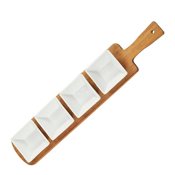 Serena Serveringsbricka. Duka upp i kvadratiska skålar som står perfekt på en avlång tjusig bricka. Serena Serveringsbricka i fint akaciaträ är perfekt för dig som vill servera tapas, såser, dippar eller tillbehör till tacosen.