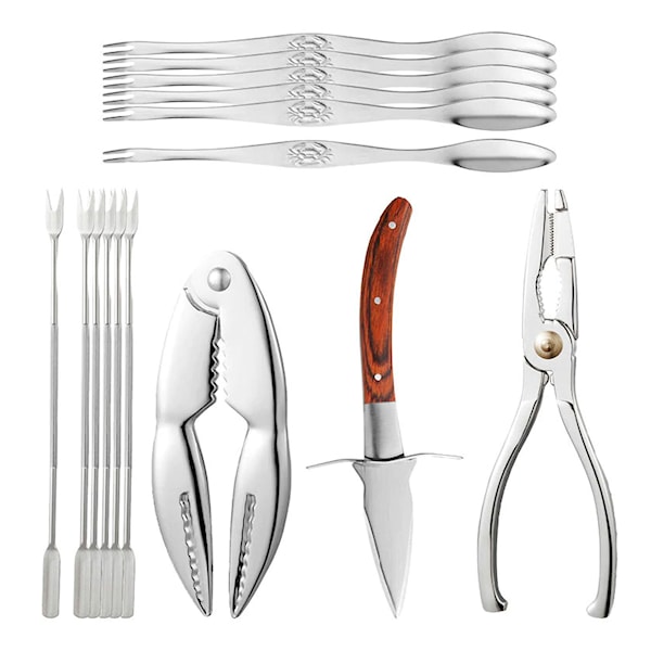 Setet innehåller 1 x kniv, 1 x tång, 1 x knäckare, 6 x kräftgaffel, 6 x krabbgaffel.
