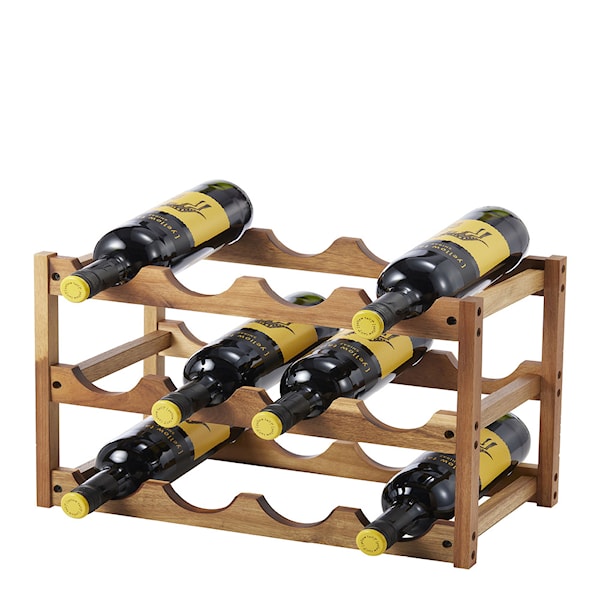 Varo Vinställ 44,2x28 cm i vackert akaciaträ har plats för 12 flaskor som ligger stadigt i det valvformade naturmaterialet. Ett fint inslag på köksbänken eller i baren.