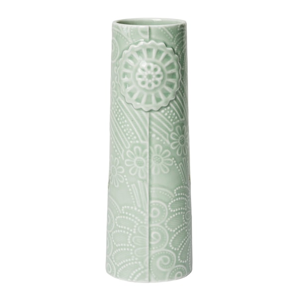 Vasen mäter 15x5 cm och är kompakt nog för att passa på en fönsterkarm, ett skrivbord eller som en del av en dekorativ uppsättning. Celadonfärgen och det lekfulla blommönstret skapar en naturlig koppling till omgivningen och tillför värme och en touch av lycka till rummet.