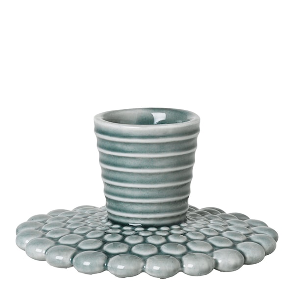 Ljusstaken mäter 4,5x8,5 cm och passar för 22 mm stearinljus, och dess kompakta storlek gör den idealisk för placering på matbord, hylla eller spiselkrans. Bubbelmönstret tillför ett roligt och taktilt element som skapar visuell intresse, medan den matta blå/grå glasyren ger en sofistikerad och lugn yta.