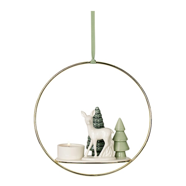 Ljushållaren levereras med ett grönt band, vilket gör den enkel att hänga i ett fönster, från taket eller där du vill tillföra en magisk touch till inredningen. När värmeljuset tänds reflekteras ljuset i den gyllene ringen och bambin och träden belyses, vilket skapar en varm, lugnande scen som fångar essensen av en stilla vinterskog.