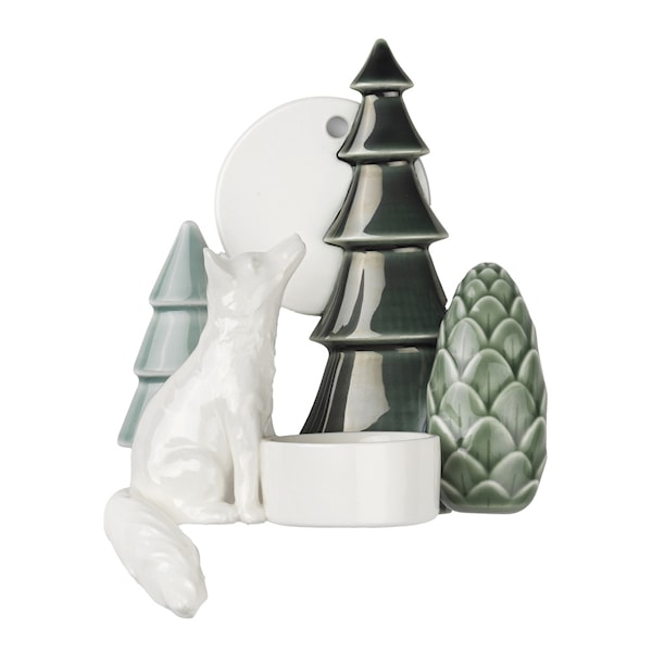 Tillverkad med precision och omsorg är porslinsfiguren och de omgivande detaljerna en vacker hyllning till skogens ro. Med sina mått på 130x115x80 mm är denna väggljushållare både kompakt och effektfull och passar standard värmeljus.