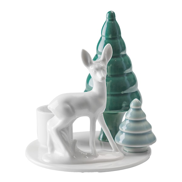 Winter Stories ljusstake Bambi från Dottir, designad av Thora Finnsdottir, ger din bordsdukning ett inslag av magi och värme under vintermånaderna. Denna charmiga ljusstake visar ett graciöst keramikrådjur som står bland två skulpterade träd och förmedlar skogens fridfulla skönhet i ett vintrigt landskap. De intrikata detaljerna på rådjuret tillsammans med trädens mjuka gröna nyanser skapar en lugn och naturlig atmosfär som sprider vinterns stilla magi i rummet.