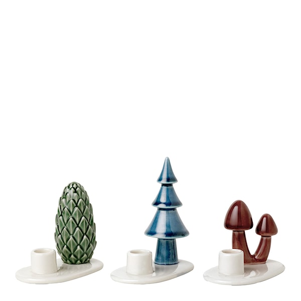 Winter Stories set med ljusstakar i tre delar, designat av Charlotte Adrian för Dottir, bjuder in skogens magi och atmosfär till ditt hem. Setet består av tre ljusstakar – en prydd med en dekorativ svamp, en annan med ett träd och den tredje med en kotte. Varje ljusstake är anpassad för 13 mm stearinljus och fungerar lika bra som vacker bordsdekoration eller placeringskortshållare, vilket gör dem mångsidiga för alla typer av dukningar. Med sin lekfulla, naturinspirerade skönhet tillför de en elegant, men ändå avslappnad, vinterkänsla till rummet som passar både till vardag och fest.