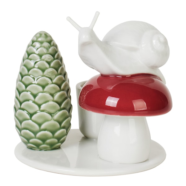 Ljusstaken är designad för 22 mm stearinljus, och när ljuset tänds sprider det ett mjukt, fladdrande sken som tillför värme till ditt rum. Den intrikata utformningen av snigeln och svampen speglar hantverkskvaliteten som kännetecknar Winter Stories-kollektionen, där varje element noggrant utformats för att fånga naturens magi.