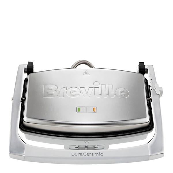 Breville paninigrill för tre skivor har en gedigen design i rostfritt stål. Denna exklusiva DuraCeramic-grill har en keramisk ”släpp-lätt”-beläggning, som gör att matlagningen går snabbare. Grillen är reptålig, hållbar och enkel att rengöra.