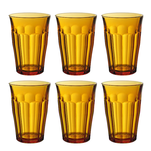 Detta set med sex Picardie-vattenglas från Duralex i en elegant färg rymmer 36 cl och är tillverkat av härdat, stöttåligt glas. Den klassiska fasettformen gör glasen behagliga att hålla i och skapar ett vackert ljusspel som lyfter både innehållet och dukningen.