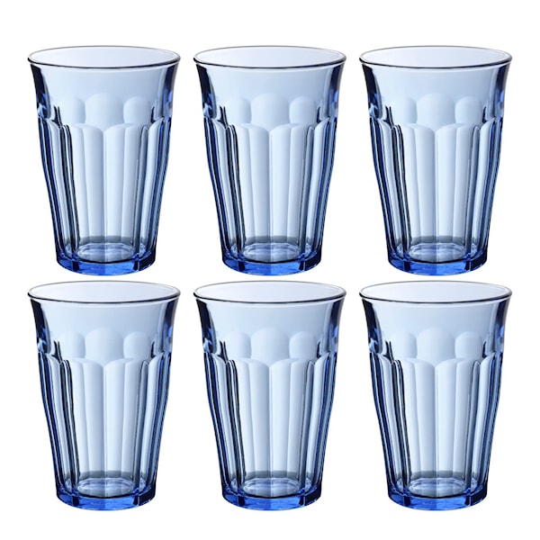Detta set med sex Picardie-vattenglas från Duralex i en elegant färg rymmer 36 cl och är tillverkat av härdat, stöttåligt glas. Den klassiska fasettformen gör glasen behagliga att hålla i och skapar ett vackert ljusspel som lyfter både innehållet och dukningen.