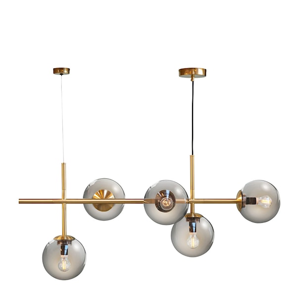 Como pendellampa 39 cm från Dyberg Larsen är en exklusiv långbordslampa som kombinerar elegant design med funktionell belysning. Med sina fem munblåsta och handmålade glaskupor som sträcker sig nedåt och åt sidorna sprider lampan ljuset jämnt och vackert över bordet och i rummet. De rökfärgade glasen dämpar ljuset och gör det möjligt att använda kraftiga E14-ljuskällor utan att riskera bländning, vilket gör den idealisk för både middagsbjudningar och dagligt bruk. De mässingsfärgade detaljerna ger lampan ett unikt och sofistikerat uttryck som passar perfekt i både moderna och klassiska hem.