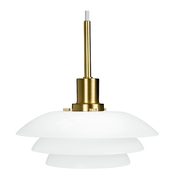 DL20 pendellampa 31 cm i opal/mässing från Dyberg Larsen är en elegant och tidlös lampa som kombinerar dansk designtradition med modern funktionalitet. Pendeln är tillverkad av opalglas med ett mässingsupphäng, vilket ger den ett sofistikerat uttryck som passar perfekt över matbordet, köksbordet eller andra platser där du vill ha både funktionell belysning och ett dekorativt inslag. De tre lagren av skärmar sprider ljuset jämnt och behagligt, samtidigt som de förhindrar bländning.