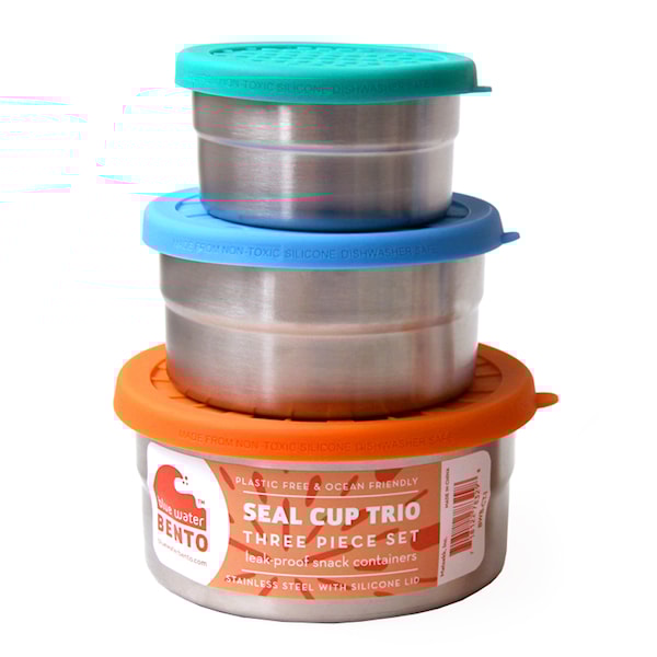 Seal Cup, ett behändigt set med tre olika lådor som alla har läcksäkra silikonlock. De går enkelt att förvara alla i den stora runda matlådan när du inte använder dom.