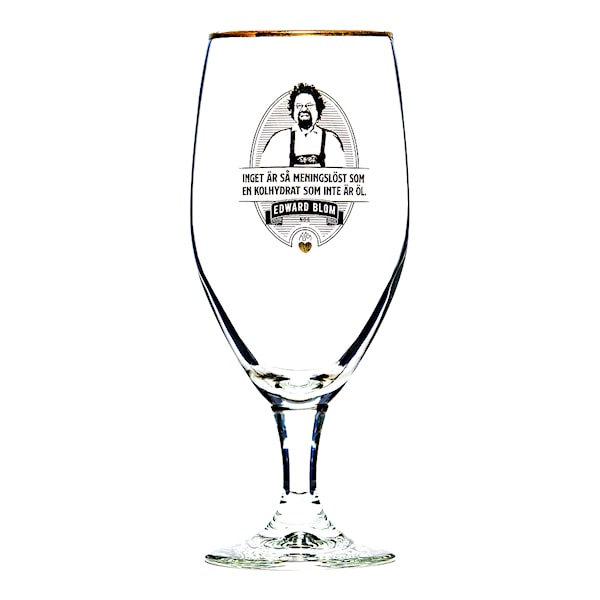 Sätt guldkant på tillvaron med detta ölglas på fot signerat Edward Blom. Citatet på glas nummer 6 lyder: "Inget är så meningslöst som en kolhydrat som inte är öl."