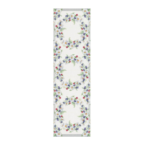 Med Blomkrans bordslöpare från Ekelund i storlek 35×120 cm får du en lättplacerad och dekorativ textil som lyfter varje dukning. Mönstret med blomkransar ger bordet en ljus, somrig ton och gör sig lika fint till vardag som till fest.