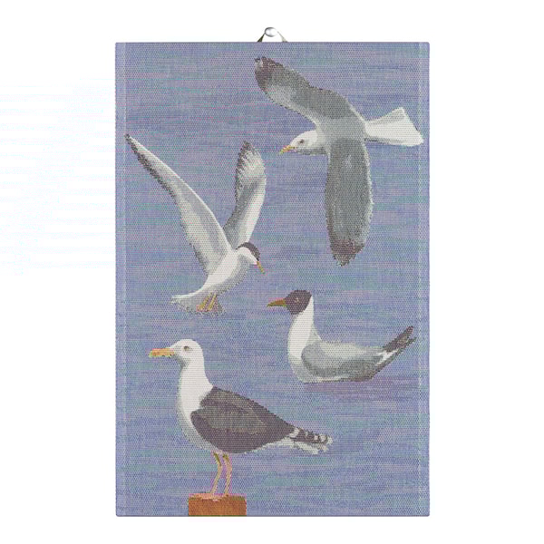 Måsar Handduk 40x60 cm, designad av Maria Olson för Ekelund Linneväveri, är en vackert blå handduk med våra vanligaste måsar på. Handduken för tankarna till en solig dag i skärgården.