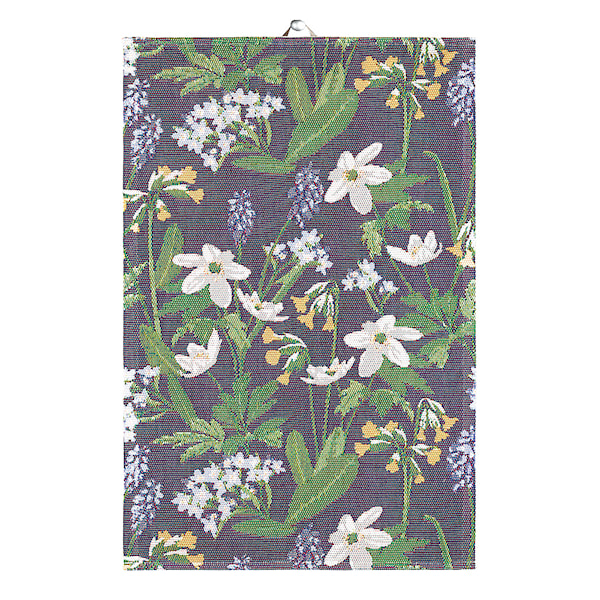 Handduk i blåa toner med vita blommor från Ekelund, ett färgglatt inslag till köket. Mönstret Spring är formgivet av designstudio Björk-Forth. Tillverkad av 100% ekologisk bomull.